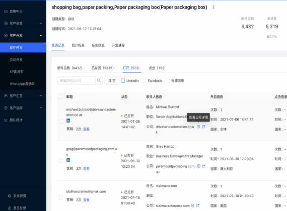 • 手动搜索甄选重要客户进行邮件群发,配以邮件自动营销和二次回访,沉淀一批只要我们发邮件他就愿意看的客户