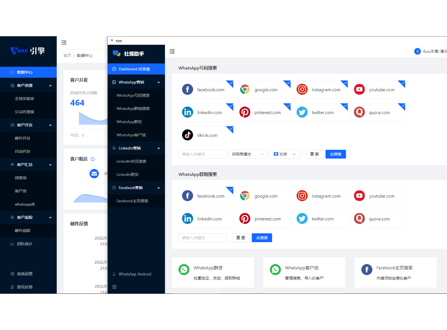 1、社媒官方授权通道和爬虫技术双重采集,覆盖FACEBOOK、领英等9个采集通道,提升关键词匹配率和What sapp账号验证通过率。